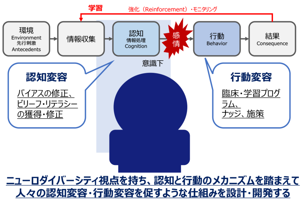 - ヒト・集団に関する認知と行動のメカニズム(インサイト)を踏まえた認知変容(ビリーフ・リテラシーの獲得・修正、バイアス修正)と行動変容(臨床・学習プログラム・ナッジ・施策)の具体的な方法(フォーサイト)を設計・開発する