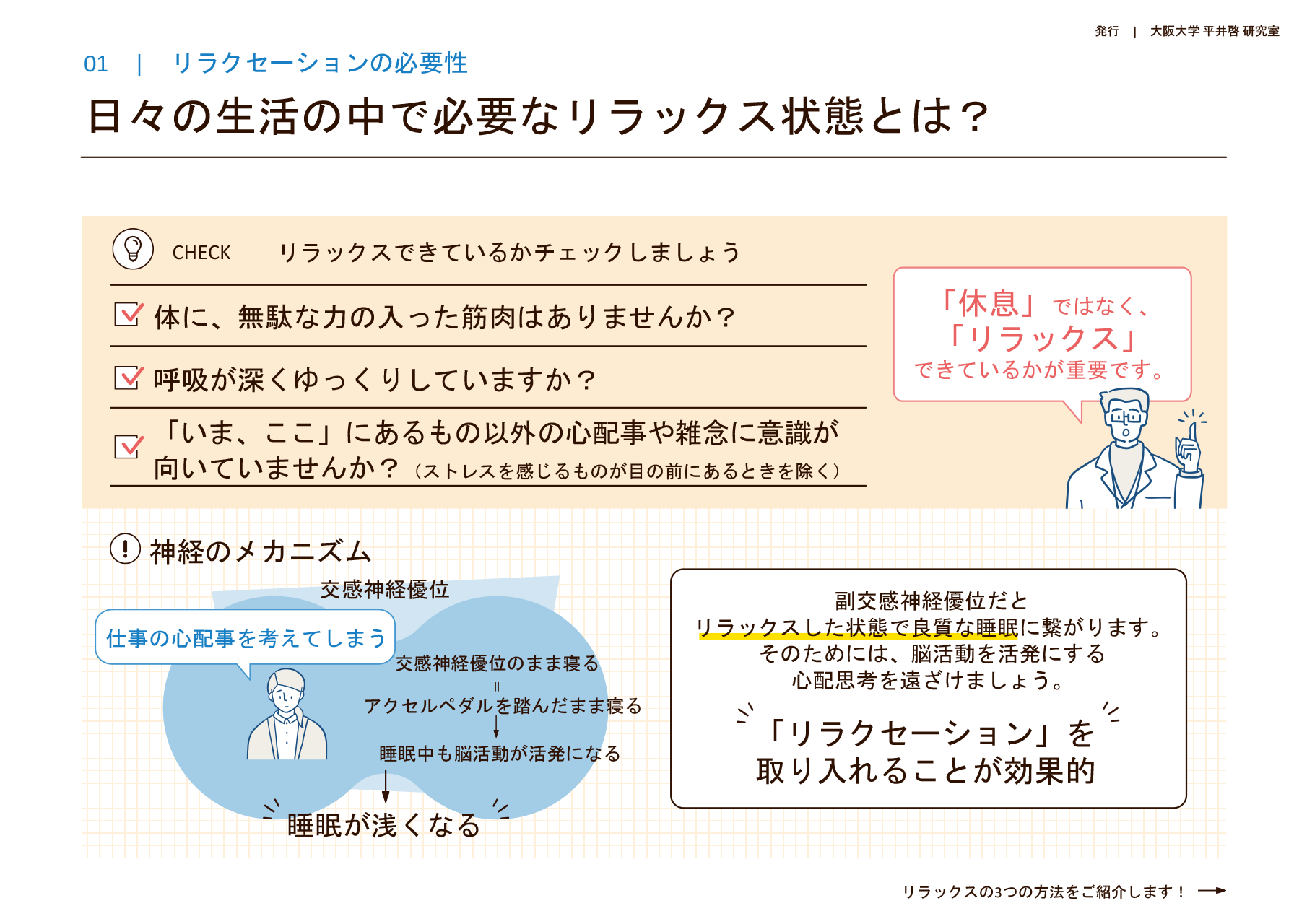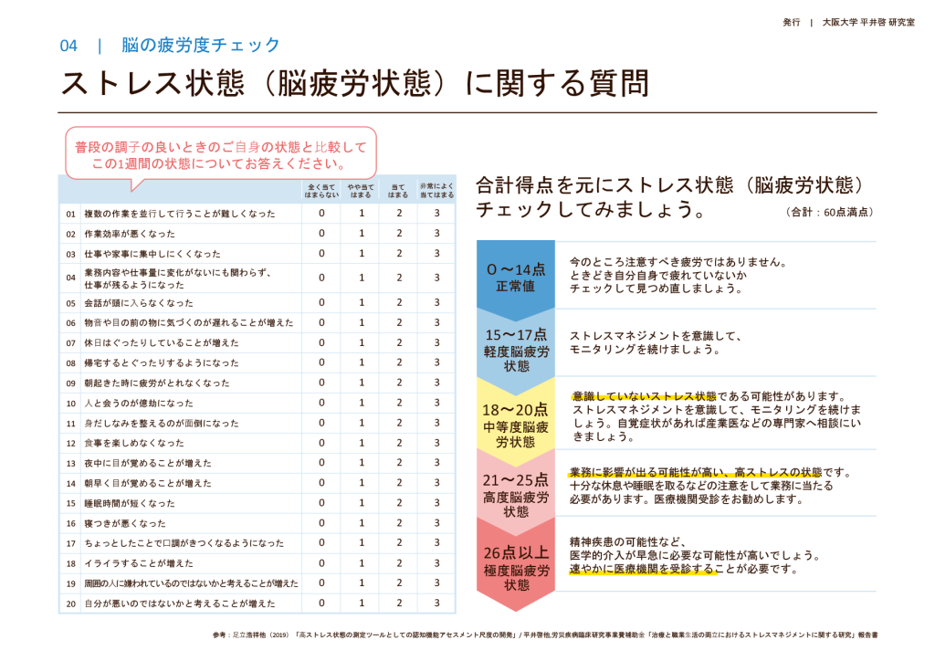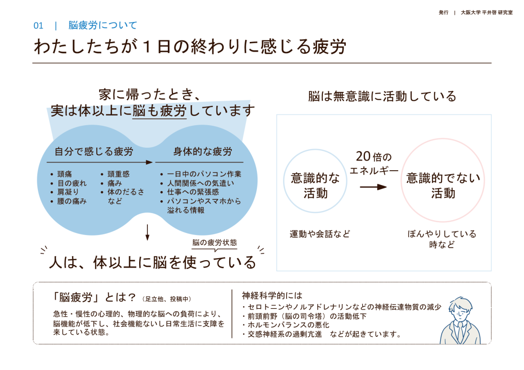 脳疲労 睡眠 リラクゼーション 研究・プロジェクトの紹介 CoBeストレス&パフォーマンスチェックシステムの開発ストレスマネジメント教材の紹介健康⾏動変容のための情報伝達と仕掛けによるヘルスプロモーション介⼊の効果検証(2022)⽣活習慣改善に対する「無関⼼層」に関する新たなセグメンテーションアルゴリズムの開発(2023)医療現場の行動経済学人材育成の仕組み構築心理支援のためのデジタルクローン開発